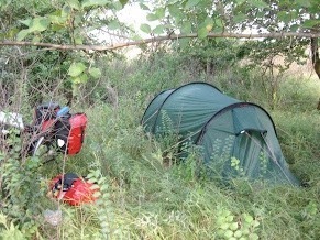 Nach 88,5 Kilometern rolle ich rechts in Feld und baue mein Zelt auf. Die kleine Baumgruppe erscheint mir für meine Unterkunft heute ideal.