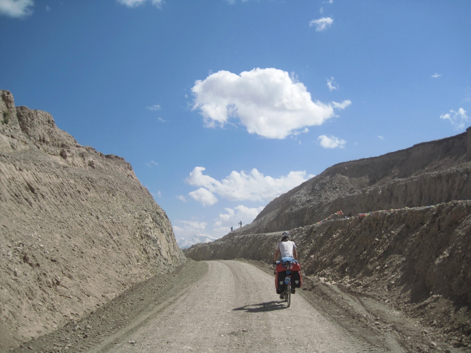 Nach der Rast wird die Strasse zum Staubsumpf und die Steigung nimmt deutlich zu. Bis übers Ventil versinken die Räder in feinstem braunen Staub. Beim Ausweichen für stärkeren Verkehr bleibt das Rad mehrfach im zentimeterhohen Staub stecken. Bei mancher Kurve hebt das Vorderrad ab. Das Atmen wird beschwerlich. Jeder Meter tut weh.