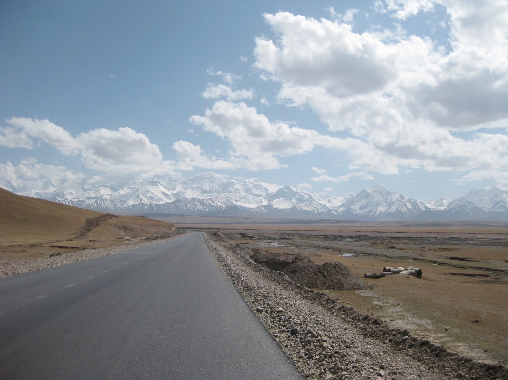 Der Blick vom Dorf Richtung Berge ist umwerfend. Schneeweisse Berge stehen vor uns. Nach einer längeren Suche nach dem Einkaufsladen im Dorf biegen wir auf die Strasse Richtung Narbu.